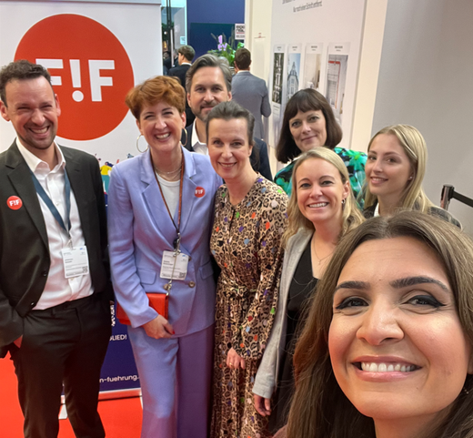 Ein Großteil des F!F Teams auf der Expo Real 2025 (v.l.): Johannes Ostwald (stellvertretender Vorsitzender), Natalie Bräuninger (Beirätin), Martin Czaja (Beirat), Anne Tischer (Gründerin und Vorsitzende), Isabella Chacón-Troidl (Beirätin), Nicola Burger (Geschäftsstellenmanagerin), Lisa Magerle (Werkstudentin), Nazanin Afshari (Vorständin)